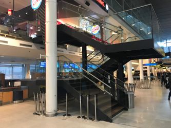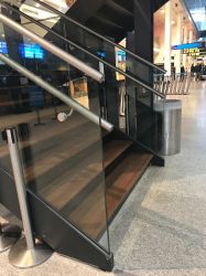 I Københavns Lufthavn har vi opført denne ikoniske trappe, opbygget i stål og glas. Trappen, der er frit svævende, var en spændende udfordring, både det konstruktive, samt den udfordring at montagen skulle tilpasses ind i et travlt miljø, som CPH Airport er.